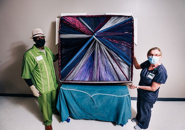 Gibson, who lives in Clanton, Alabama, describes his works as “symmetric abstract design string art.” After months of treatment, UAB Medicine surgeons, doctors and therapists, and caregivers including his wife Jacquelyne, have helped Gibson regain not only his health but the grip and dexterity needed to create his intricately vivid designs.