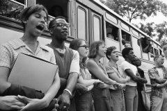 Student civil rights activists join hands and sing as they prepare to leave Ohio to register Black voters in Mississippi. The 1964 voter registration campaign was known as Freedom Summer. Photo Credit: Ted Polumbaum/Newseum collection)