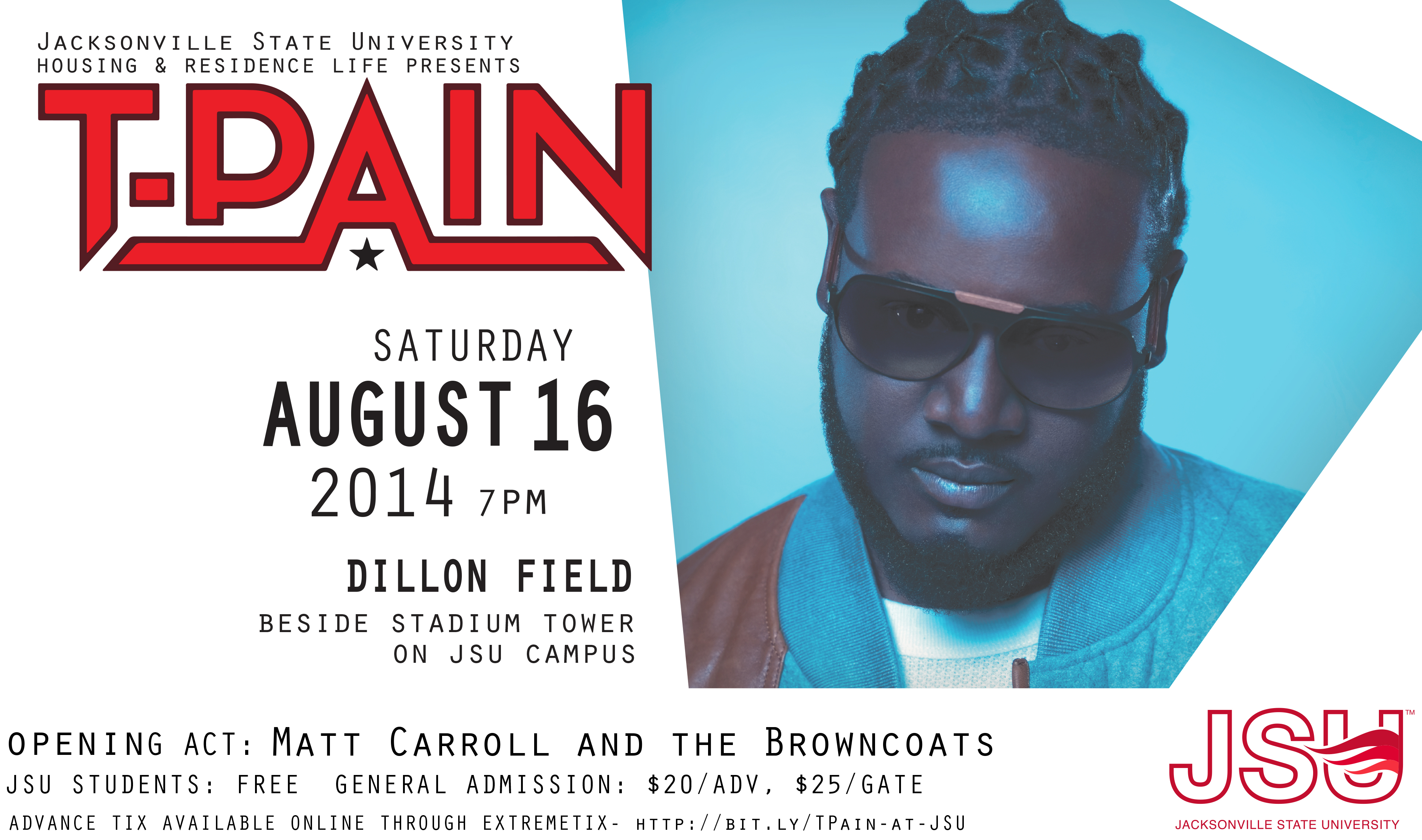 Come back to campus with T-Pain! Jacksonville State University’s Office of Housing and Residence Life presents T-Pain in Concert along with Matt and the Browncoats on Saturday, August 16 at Dillon Field, adjacent to JSU’s Stadium Tower.