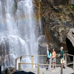 The trail to Crabtree Falls begins in the Crabtree Meadows picnic area located at mile post 339.5 along the Blue Ridge Parkway. A steep descent nearly one mile down the mountain takes you to the base of the falls where you can view the 100 foot drop of the Toe River.