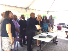 Caption: Bishop James L. Davis, Presiding Prelate of the Ninth Episcopal District, the Board of Directors of the Daniel Payne Foundation, and members of the Ninth Episcopal District at the “signing” to purchase the Daniel Payne Community Plaza, August 12, 2014.