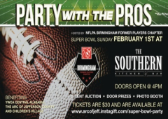 BIRMINGHAM, Ala. – Area football fans are invited to Party with the Pros on Super Bowl Sunday 2015. The NFLPA Birmingham Former Players chapter will host a viewing party at The Southern Kitchen and Bar in Uptown on February 1. Doors open at 4 p.m. Tickets are $30 and are available at www.arcofjeff.instagift.com/super-bowl-party.