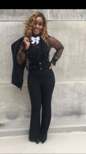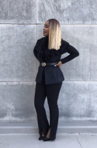 There’s nothing wrong with all black, either. An all-black pants suit with specks of white grab attention and say, “I’m ready for business.”