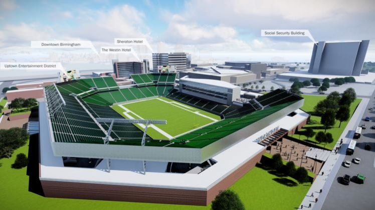 A sign of teamwork? Business leaders donated to build a state-of-the-art $22.5 million football headquarters and practice facility. The city of Birmingham and Jefferson County pitched in to build a $174 million, 45,000-seat stadium, which is expected to be ready for the 2021 season.