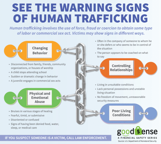 If you recognize warning signs, like those listed above, you are encouraged to report your concerns to local law enforcement immediately. It can be difficult to speak up. But law enforcement would rather investigate a tip than risk someone being trapped in a cycle of trafficking with no clear way out.