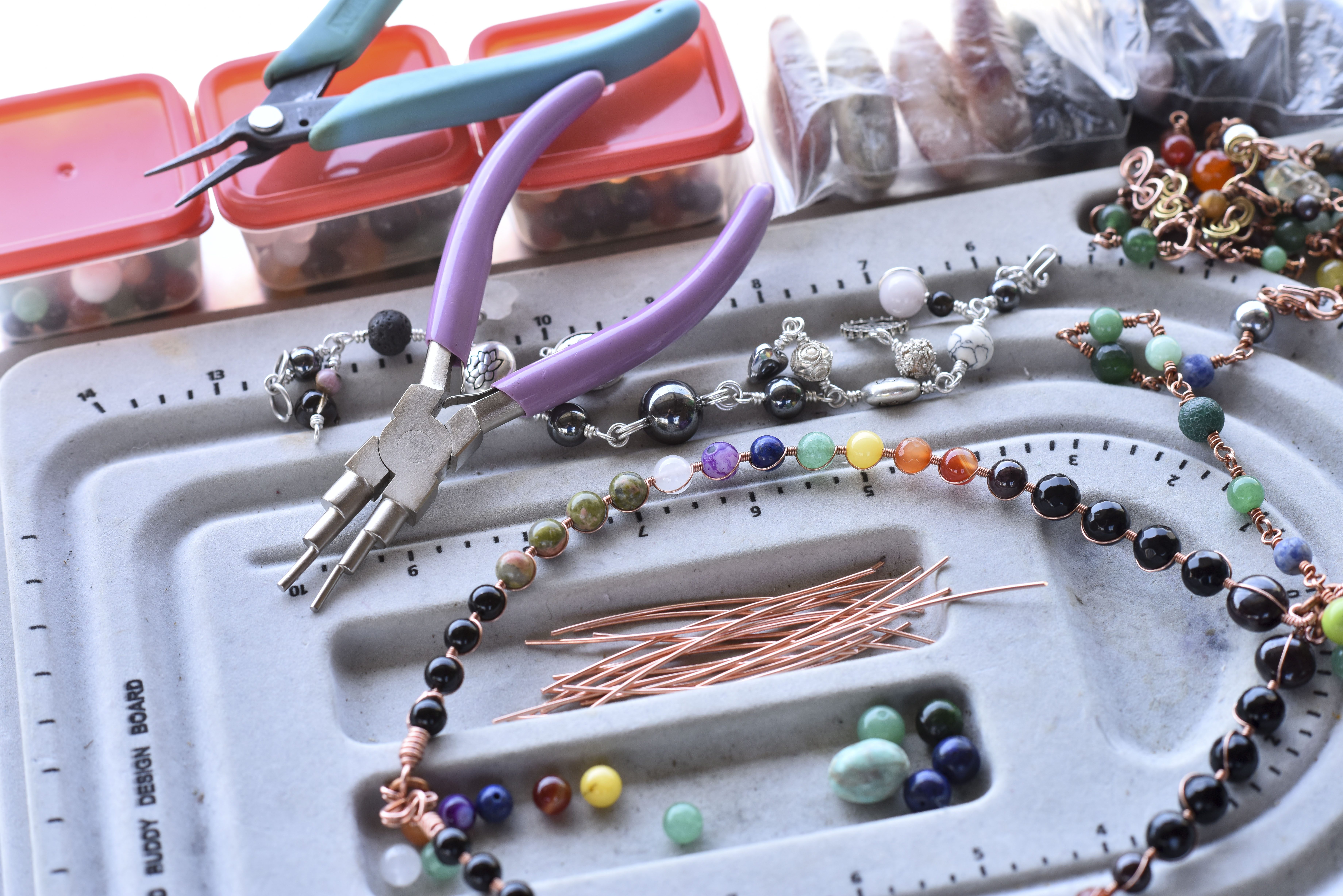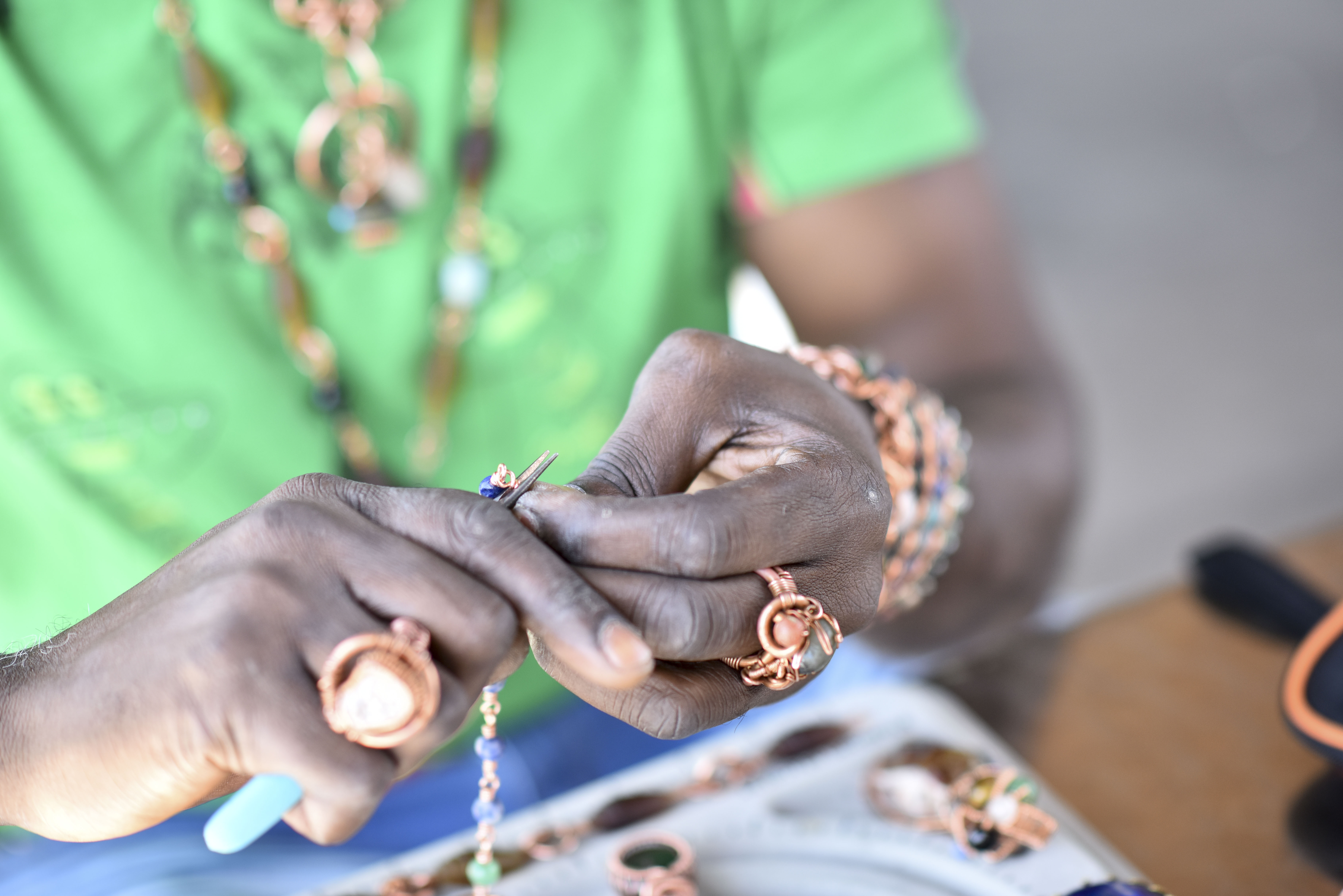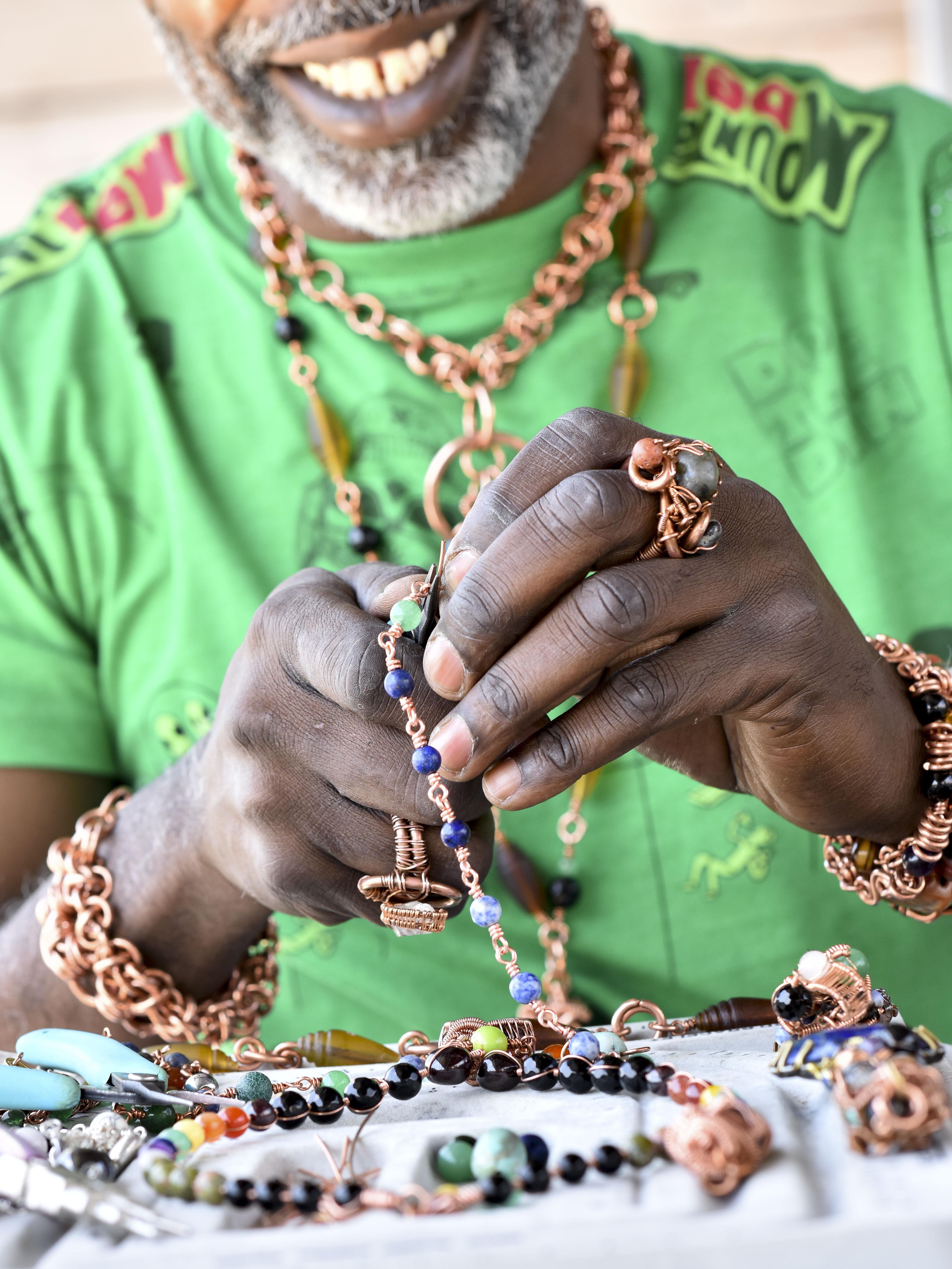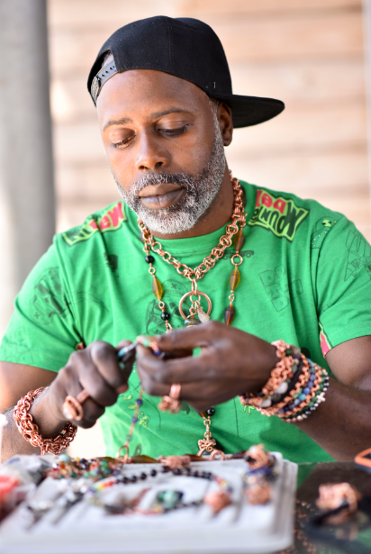 Randle tries to keep at least 10 pieces on him that are just ready to go, generally bracelets and necklaces, because some people are specific about the energy they want and the particular gemstones and colors they want. His jewelry incorporates various materials—copper, sterling silver, gold wire, crystals, and gemstones—that he gets from different sources.