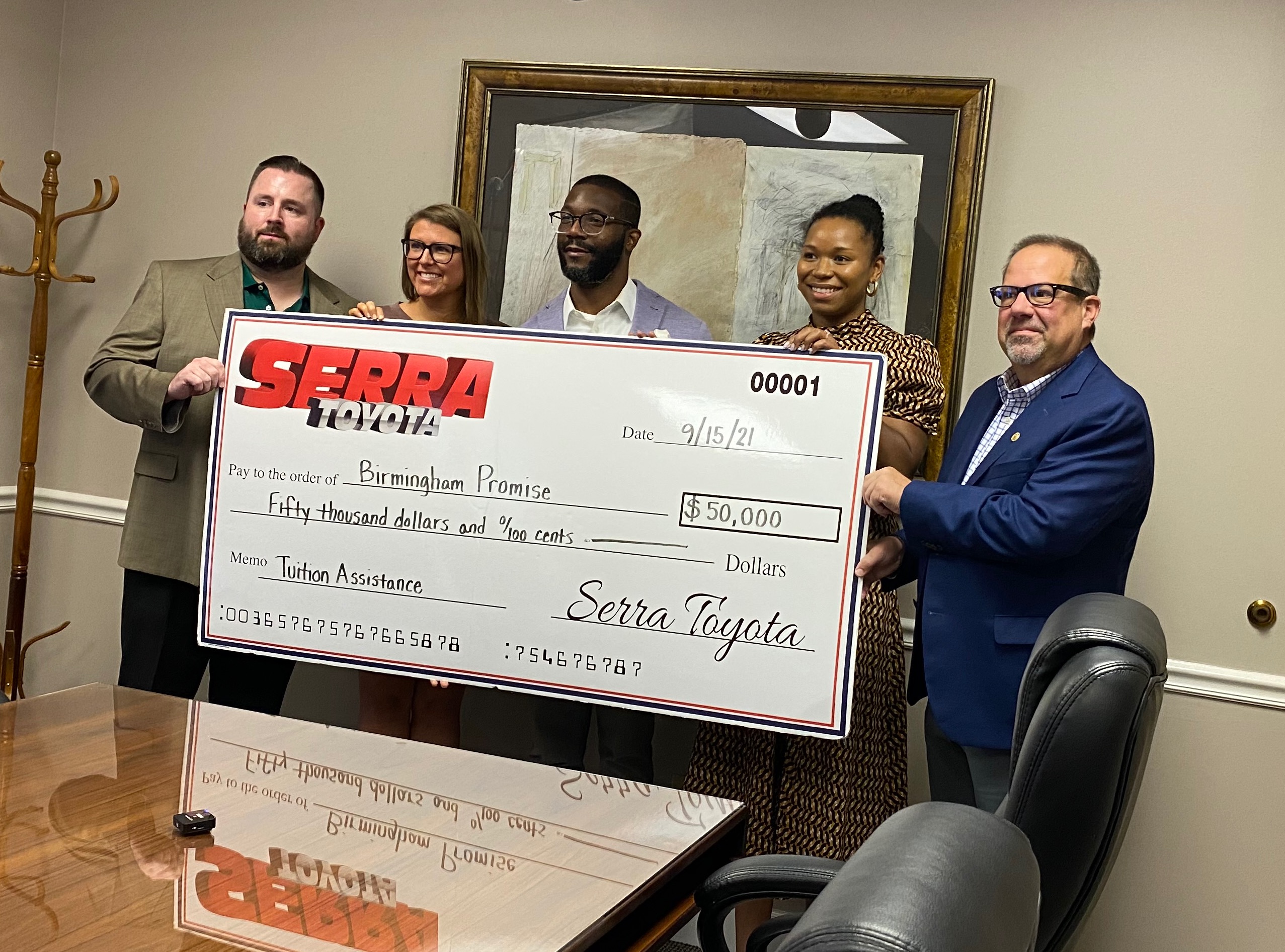 Steve Serra Auto Group this week presented Birmingham Promise with a $50,000 check to support college scholarships and work experiences for students in Birmingham City Schools.