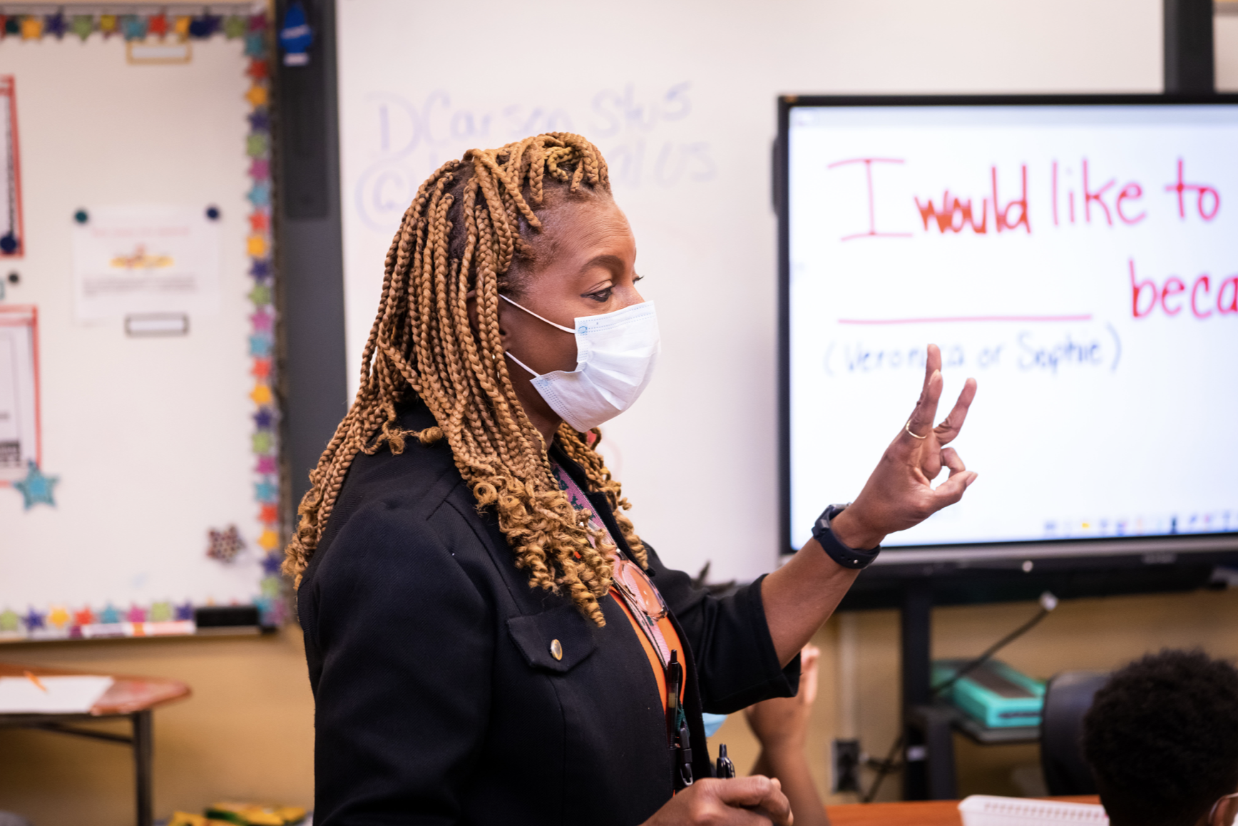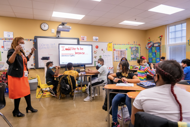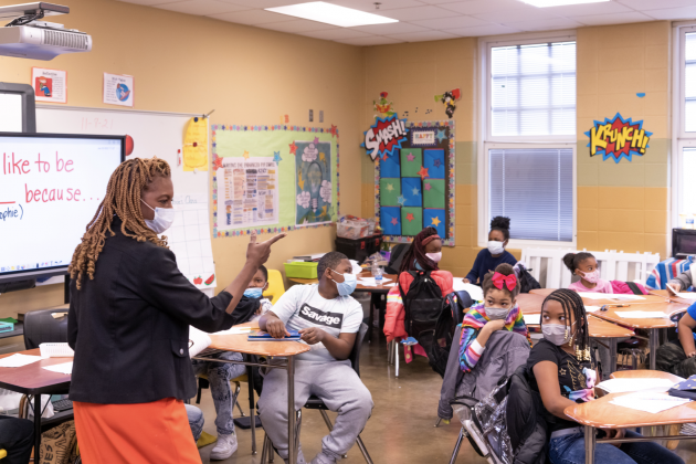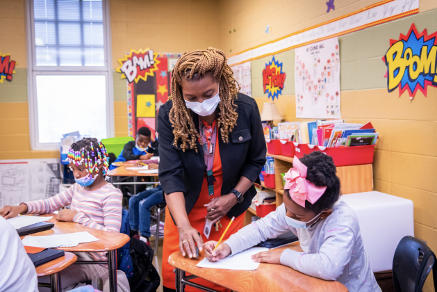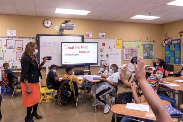 As the youngsters begin to write out their answers, Drake gives tips on writing, telling them to restate the question followed by “because” and their reasoning. She loops in and around the circles of desks, checking answers and giving further instructions to the class and to individual students.