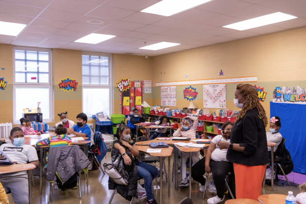 Once inside, Drake thanks the boy and stands just out of the classroom’s center, quizzing the students on a story they read yesterday called “Finders Keepers.”