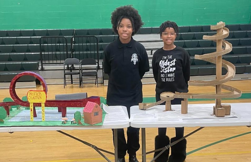 The school held a STEM showcase last week that featured student projects across all grade levels that included roller coasters, business pitches, and creative displays. Eighth grader Ra’Naja Bell-Rucker proudly shared her role in designing and presenting a table of roller coasters, created with the help of classmates.