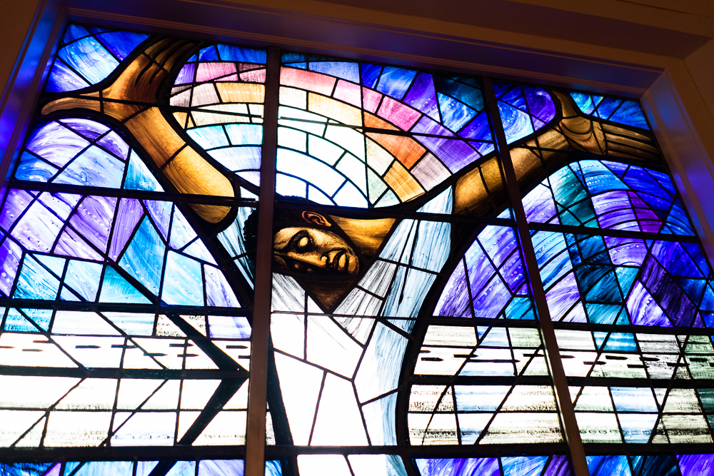 Petts’ depiction of a Black Christ is recognized throughout the world as one of the Civil Rights Movement’s most iconic pieces of art and stands at the front of the church. The right hand pushing away hatred and injustice, the left offering forgiveness. The glass was installed in 1965.