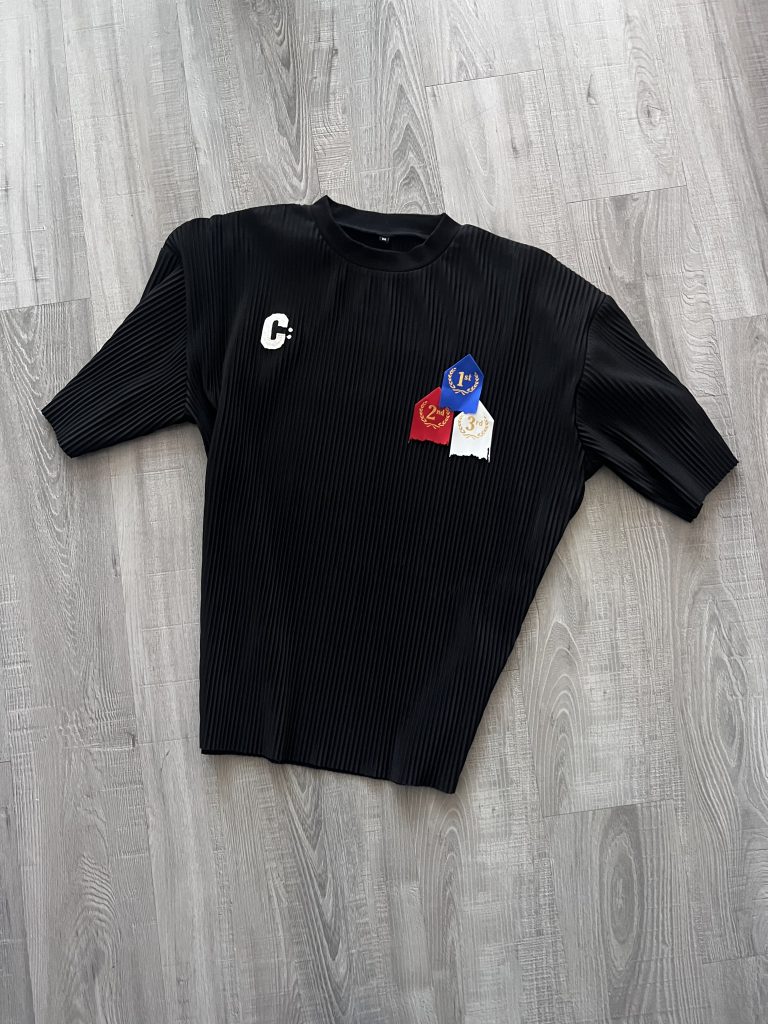 “Back in the day we used to get little ribbons from field day…a class fair…science fair,” explained Crutch. “I was like ‘okay, this is a dope idea’ and I put it on a pleated shirt instead of the regular cotton t-shirt…to be innovative…it [also takes people] back to a point in their life where everything [was] easy…[a time where] you can just enjoy your classmates [and] friends.”
