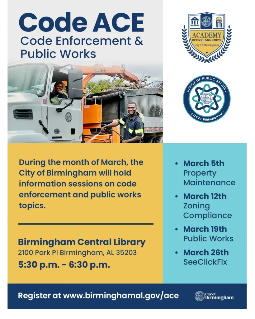 CODE ACE launches Thursday, March 5, and will take place each Thursday that month, providing residents with direct access to city leaders and departments responsible for maintaining safe, vibrant neighborhoods. Each session will be held from 5:30 to 6:30 p.m. at the Birmingham Public Library, Central Branch (Downtown), offering clear, practical information and opportunities for engagement.