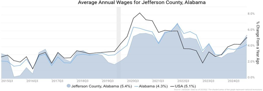 The average worker in Jefferson County earned annual wages of $71,647 as of the second quarter of 2025, and average annual wages per worker increased 5.4 percent in the region over the preceding four quarters. For comparison purposes, annual average wages were $75,686 in the nation as of Q2 2025, Traywick said. One of the higher-growth sectors, in terms of wage growth, has come from manufacturing which has seen annual average wages grow by more than $20,000 since 2020.